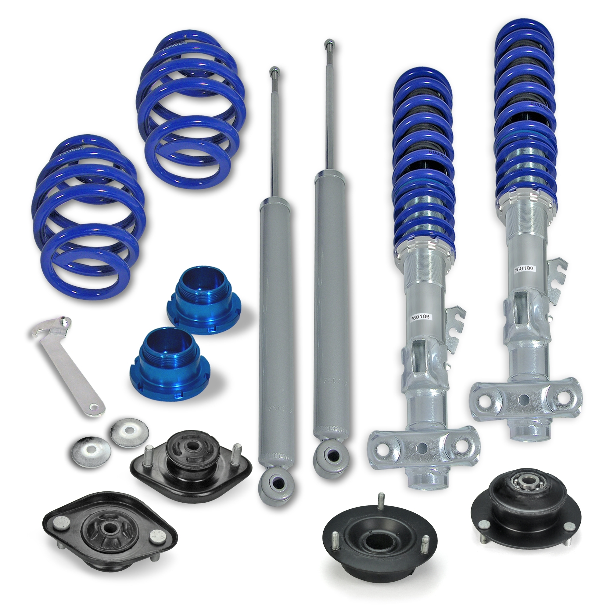 The BlueLine coilover suspension kits are highgrade car-specific suspension components with a lowering on frontaxle between 40-60 mm and rearaxle between 30-45 mm. The range of adjustment gives an individual body lowering. The kits have a huge transverse force absorption. The initial spring tension survives in complete range of adjustment. Adjustment after installation. Car-specific versions: front thread / rear thread.